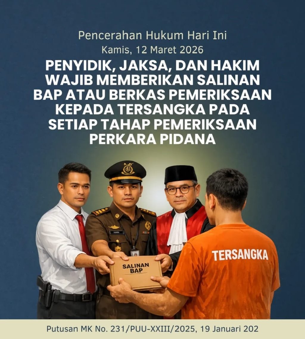 Jakarta, — Putusan Mahkamah Konstitusi (MK) kembali menegaskan pentingnya perlindungan hak tersangka dalam proses peradilan pidana. Dalam Putusan Nomor 231/PUU-XXIII/2025 tertanggal 19 Januari 2026, MK menyatakan bahwa penyidik, jaksa, dan hakim wajib memberikan salinan Berita Acara Pemeriksaan (BAP) atau berkas perkara kepada tersangka pada setiap tahap pemeriksaan.